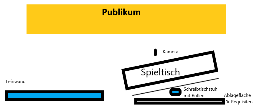 Benötigt werden ein abgedunkelter Raum, Licht und Ton, ein 4m langer Spieltisch (bzw. mehrere von gleicher Höhe und Breite), ein Mikroport, Beamer und Leinwand.